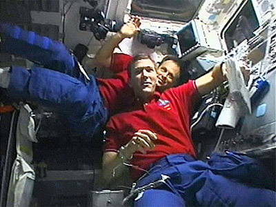 A file photo shows Israeli astronaut Ilan Ramon (L) reaching for a small Kiddush cup he is using to commemorate the Jewish Sabbath as it floats on the flight deck of the space shuttle Columbia on January 18, 2003, as fellow astronaut