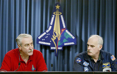 NASA Administrator Sean O'Keefe (L) and former shuttle Commander William Readdy speaks at a