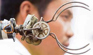 Chinese farmer Wu Yulu, 41, sits next to his robot, Lao Wu, at his home on the outskirts of Beijing. Wu, who only managed to finish primary education, started building robots for fun more than a decade ago. The fifth-generation of his remote-controlled robots, which can do simple household chores, have attracted nationwide publicity and interest from government institutions. |