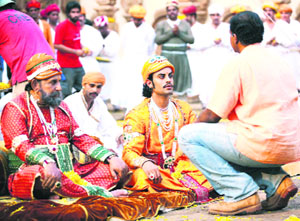 Amandeep Dhaliwal (second from right) takes last-minute tips from Ashutosh Gowarikar, director of “Jodhaa Akbar,”during the shooting of the film. |