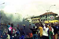 | Tempers flare up in Lagos from Alex Duval Smith in Lagos PERCHED on the back seat of a crowded yellow minibus, Olaguju was handing out plasters to his friends. The cut on your nose is bleeding again, he told one of them, Adaoye. Hausas, came the seething reply, the word laden with racial hatred. In the riot chaos of Agege Motor Road in the Lagos suburb of Idiora, Olaguju Gbemigas communal taxi had become a first-aid retreat for Yorubas, the main ethnic group in this sprawling city of nine million people. We have to get the Hausas. They were made powerful by the white man, they run the military, they keep us from getting jobs, they killed Abiola, they have destroyed our country, said Adaoye Phillips as a dozen more youths came running towards the beat-up minibus. Behind them, the lights of a military personnel carrier pierced the dust they threw up with their feet. On the day that saw the end of a month of junta-imposed mourning for Nigerias late dictator, General Sani Abacha, Lagos spontaneously For Adaoye, Olaguju and hundreds of other young men caught up in the rioting and looting yesterday and Tuesday night, Nigerias future was now firmly an ethnic and religious issue. In less populous districts of the countrys main city, an eerie sense of inertia had crept in. Beneath drizzle and flags at half mast, schools closed and the normally bustling streets were deserted. Military roadblocks kept cars out of the centre and minibus drivers, fearing trouble, took the day off, lining up their vehicles in the usual petrol queues. But the few cars on the road placed fresh branches of green leaves on their dashboards. Leaves have come to be a symbool of the democracy nipped in the bud when the results of elections on June 12, 1993, apparently won by Abiola, were nullified. The three private television stations and the independent Ray Power FM ran repeated tributes to Abiola, phone-ins and lively discussion programmes with opposition figures. To hear them, you would have thought you were in a democracy. To see the deserted highways of Lagos you would have thought yourself in a mourning cold-war autocracy. To meet Adaoye, Olaguju and their mates in American hood wear, you felt at the centre of a gangland feud but one with undertones of civil war. Only war can happen now, said 27-year-old Adwale Ayo, a car mechanic buying a cigarette on a stand by Olagujus minibus. We have nothing else. People die in wars but then people are already dying of hunger in Nigeria. In the rural areas, people go for six months without electricity or water. Even in Lagos, where we are Yorubas, the Hausas get the jobs first in parastatals and federal offices. But we, the Yorubas, are the educated ones, they are just playing on privilege. It will not be any different with the new man, said Mr Ayo, using the common Lagosian expression for Gen Abachas successor, Abdusalam Abubakar, whose name they disdainfully affect to forget. As a crowd gathered around the minibus, Yomi Segun, aged 36, a typewriter salesman, met with a roar of approval at the suggestion that Nigeria should be run by three governments one for the lbo tribe, in the east, another for the Hausa, in the north, and a thrid for the economically powerful Yoruba, in the south and west. The crowd would not countenance the suggestion that in the worlds most linguistically complicated country 250 tribes in 30 states and some 400 languages what they were advocating was ethnic warfare. There is no opposition left, nobody trusts politicians, nobody goes to vote. Even Abiola had dined with the military in his time. So all this talk of transition to democracy is a joke to us. The Guardian, London |