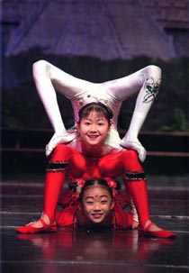 ![]() Xue Wang, aged 12 (bottom), and Lisha Li (13), both from China, practise some of their contortion acrobatics on Thursday afternoon, at the Splendid China Florida theme park near Orlando, Florida. The two young girls are part of a travelling team of acrobats who will perform at the central Florida attraction. AP |