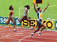MOSCOW : Marion Jones of USA crosses the finish line winning the 100 meters at the IAAF Grand Prix Finals at Luzhniki stadium in Moscow on Saturday. Jones capped an undefeated season and pocketed over $ 600,000 by winning the 100 meters and the long jump. AP/PTI Jones