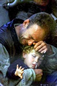 ![]() PETROVEC: Seen through the glass window of a bus, an Albanian man weeps with a child in his arms as the first bus of 151 refugees arrive at the Petrovec Airport for a flight out of Macedonia, Monday. The group of refugees were bound for Turkey at the start of a massive airlift. AP/PTI |