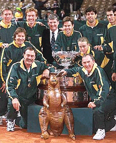 ![]() Australian Davis Cup team captain John Newcombe (left) and assistant coach Tony Roche (right) pose with squad members next to the Davis Cup trophy after winning the Davis Cup final against France on Sunday in Nice, French Riviera. AP/PTI |