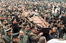 ![]() YERVAN, ARMENIA: The coffin with the body of slain Armenia Prime Minister Vazgen Sarkisian is carried to Opera House during a memorial ceremony in Yerevan on Saturday. Thousands of Armenian mourners paid their last respects to their slain Prime Minister and seven other victims of last week's shooting in Parliament. AP/PTI