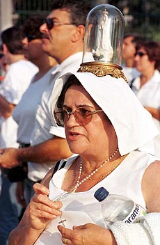 ![]() LISBON : A woman carrying an image of the Virgin Mary on her head, prays outside United States embassy in Lisbon on Thursday. Thousands, most of them wearing white as a sign of solidarity with the East Timorese people, demonstrated outside the embassy demanding international intervention to stop the violence raging through the former Portuguese colony of East Timor. Vatican media reported Thursday that anti-independence militias in East Timor are targeting the Catholic church, slaying priests and nuns. AP/PTI |