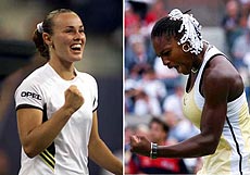 Hingis, Serena set up title clash NEW YORK, Sept 11 (AP) Serena Williams did her part by dethroning Lindsay Davenport as US Open womens champion yesterday, but big sister Venus limped off in defeat to Martina Hingis and missed a chance at historic all-in-the-family final. Serena reached her first major final with the aid of a shanked shot that squirted in for a key break and 12 aces that helped seal the victory. The muscular 17-year-old came back from a dreadful drubbing in the second set, in which she lost 14 of the last 16 points, then put on a buoyant display of grit and athleticism to win 6-4, 1-6, 6-4. Venus, who was 17 when she lost in the final against Hingis two years ago, couldnt complete the sister-sister matchup that their father, Richard, had been predicting for the past few weeks. Now shes playing for two people, Venus said. Hopefully, I gave Martina a good workout today. In an exhausting duel that left Venus cramping at the end and barely able to reach the net on serves, Hingis came through with a 6-1, 4-6, 6-3 victory. It was a tremendous match, especially in the third set, Hingis said. I tried to keep her running. I knew she was cramping. It was more a battle of wills than a display of beautiful tennis with Venus serve broken nine times and Hingis six. But what it lacked in aesthetic value, it certainly more than made up for in tension and effort with both players producing spectacular shots at times. None was better than the one Hingis made to set up match point. Venus had flicked a deft drop volley near the sideline, across the court from Hingis. The 18-year-old from Switzerland chased it down and sent a running one-handed backhand over the net post into the corner. It was unbelievable, Hingis said. I was so lucky. I put my racket there and it just went in. I was running, like, boom, boom, boom, one step after the other. I didnt know what was going to happen. I didnt believe I was going to get it in but it went into the corner. The crowd roared at that shot, as it had on so many others, and Hingis followed it with a service winner to advance to her third Grand Slam final this year and seventh overall. She already owns five major titles. Rain delayed the start of the semis finals by two and a half hours, and the players had to cope with conditions that ranged from glaring sun to dark gray shade. Little separated Serena Williams and Davenport in the first set until the last game, when Williams came up with a darting volley crosscourt for deuce. Davenport netted a forehand on the next point, then couldnt handle a deep forehand by serena on set-point. Venus watched the first set at courtside, then retreated to warm up for her match. Davenport, No 2, seemed on the way back to the final when she raced through the second set in just 24 minutes and allowed Serena only two points in the three service games she was broken. Serena seeded No 7 and playing in only her second US Open, found the range again when she served for the first time in the third set. She unleashed three straight aces to let Davenport know she wasnt going away. They stayed on serve to 3-3, when Serena gained the first break-point of the set with a running forehand volley crosscourt after a superb rally. Then luck entered the