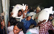 ![]() East Timorese residents, desperate for food, go on a looting frenzy at the warehouse of Bulog, the Indonesian food logistics agency, in Dili, East Timor, on Wednesday. With the capital completely destroyed and no access to markets for food, hundreds of East Timorese broke into the warehouse carrying off bags of rice, sugar and cooking oil. AP