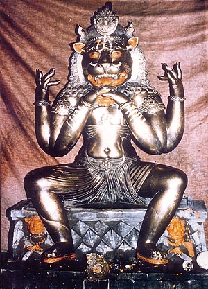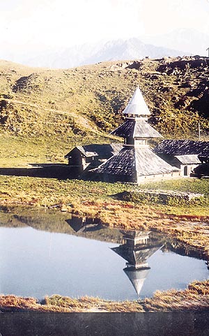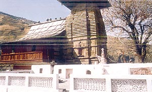 Dedicated to Shiva, the temples of Trilokinath, Panchvaktra, and Bhutnath in Mandi are all in shikhara style, and are of immense archaeological interest. The Trilokinath temple (1500 AD) contains a life-size, three-faced stone image of Shiva, riding a bull with Parvati in his lap. The main image in the Panchvaktra (the Five-faced One) temple near the confluence of the Beas and the Saketi, is of interest since the five images are not placed in one row as is usually the case with polycephalic statues, but in such a way that the fourth face is on the reverse side of the slab. However, the most popular shrine in Mandi is that of Bhutnath who is venerated as the guardian of the town and represents Shiva as the Lord of Creatures. Its porch is supported by fluted pillars. Of the modern temples in Mandi, the finest one from an artistic standpoint is the sanctuary of Ardhnari, the stone image of which represents Shiva and his divine consort Parvati, the right half being devoted to the former and the left to the latter. A peculiar feature of the shikhara-style temple at Balag, near Shimla, which contains a Shivalinga, is the umbrella-shaped canopy of wood around the sun-disc which forms the top of the spire. There are impressive carvings above the entrance with sloping rows of wooden pendants. Dating back to 7th-8th century, the Hateshwari (Durga) temple at Hatkoti, on the banks of the Pabbar, belongs to the classical shikhara style and has an exquisitely sculpted brass image of the goddess. The temple has rich and variegated wood carvings which include figures of gods and goddesses. Among the early wooden temples of Himachal Pradesh, mention may be made of the Lakshana Devi temple at Bharmour, Shakti Devi temple at Chhatrari, and Mrikula Devi Temple at Udeypur in Lahaul. The remarkable feature of the 8th-century Lakshna Devi temple is its wooden architecture. It bears an affinity to the architecture of Kashmir and Gandhara and shows traces of classical influence, peculiar to the monuments of the north-west. Inside there is a rectangular mandapa interlinked by railings on both sides. Behind the mandappa is the sanctum, enshringing the brass image of the goddess. Regarded as one of the most holy spots in the western Himalayas, the Shakti Devi temple built in 8th century is surrounded by an open pradakshina path supported by twelve massive columns. Images of Lakshna Devi and Shakti Devi, sculpted by master craftsman Gugga, are considered as two of the finest bronze statues in the world. The temple of Mrikula belonging to the 10th-11th century is highly remarkable for its wood carvings. Pagodas offer a peculiar construction design. Their pyramidal structure with tiered roofs distinguish these from other Himalayan temples. Some of these temples are Hidimba Devi at Manali, Tripura Sundri at Naggar, Triyugi Narayan at Dayar and Adi Brahma at Khokhan. Erected on a small clearance of dense deodars the Hidimba temple was founded in 1553 AD. It has square roofs in tiers of diminishing sizes above which is a kind of circular wooden cone, which is again surmounted by a brass well and a trident. The temple rises about 80 feet from the ground, but is not perpendicular.