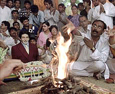 Worshipping Big B on Guru Purnima Kolkata, July 5 The celebration, complete with the traditional “guru puja,” “guru mangalkamna yajna,” “pushpanjali” (flower offerings) and chanting of Vedic hymns in honour of the “guru”, began early in the day marking the beginning of a four-month long “Amitabh Utsav” envisaged by the Amitabh Bachchan Fans’ Association (ABFA) here. “He has touched the lives of millions with his soul-stirring movies, each of which has a moral lesson for us lesser mortals,” the ABFA state secretary, Mr S.P. Kamat, said. For Mr Kamat and over 10,000 registered fans of the thespian, “Amitji’s” meaningful movies and rich dialogues in baritone have become a part of their lives.
