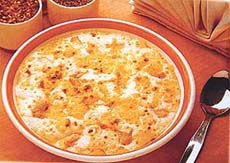 Cheese grated 1 cup Butter 250 gm Self-raising flour 1 cup Milk 1½ cup Eggs 5 Salt and pepper to taste. Method:Melt butter in a heavy bottomed pan and roast the flour lightly on low flame for 5 minutes. Stir continuously and do not allow it to become brown. Add milk and keep stirring to get a smooth paste. Cook till it becomes thick. Separate egg yolks and whites and add egg yolks one by one to the milk and flour mixture. Add salt and pepper. Set aside. Whisk the egg whites briskly till stiff peaks are formed. Gently stir these into the sauce and add ½ cup grated cheese to it. Prepare an oven-proof dish by greasing it with a little butter. Sprinkle 3 tbsp grated cheese on its base and sides. Pour the mixture into the dish till it is three quarters full. Sprinkle the remaining cheese on top of it. Bake in pre-heated oven at 375°F for 25-30 minutes or till the top is golden brown. Paneer dal Ingredients: Urad dal 250 gm Cottage cheese 150 gm Tomato ginger chopped 1 tbsp Onion 1 Oil (for frying) ½ cup Turmeric powder ½ tsp Salt and pepper to taste Red chilli powder ¼ tsp Coriander leaves( chopped) 1 tsp Method:Wash and soak the urad dal for 15 minutes. Boil 4 cups water with turmeric and salt and add dal. Cook on slow fire. Cut paneer into small sized pieces and fry till light brown in colour. Add these to the dal when it is half cooked. Heat 1 tbsp oil in another pan and fry onions till transparent. Add ginger and fry for some more time. Add chopped tomato and fry till oil separates. Add garam masala and add the mixture to the dal paneer. Simmer for some more time. Garnish with chopped coriander and serve hot with roti. Cheese cones Ingredients: Maida 150 gm Butter 50 gm Cheese 50 gm Milk ½ cup Baking powder ½ tsp Salt ½ tsp Pepper ½ tsp Method:Sift flour, baking powder and salt twice. Rub in the butter till flour looks like bread crubs. Add grated cheese and knead to get a soft dough by adding enough milk. Roll the dough into two rounds of half inch thickness (dust two sheets of butter paper with flour and keep the dough in them and roll with a rolling pin). Sprinkle pepper powder on top and cut into ½ inch wide strips. Roll these strips around greased metal cones or horns in a spiral form and press the ends firmly. Prepare all cones in this manner. Bake these for 15-20 minutes in hot oven. Remove metal homs after these are cool. These cones can be served plain or with a filling. Variations: