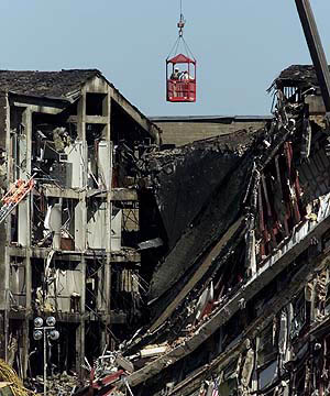Rescue workers survey the damage at the area of the Pentagon Building from an inspection basket while outside of the US military headquarters on September 15, 2001. —Reuters