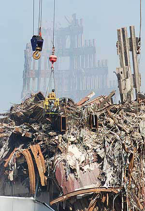 A worker suspended from a crane hangs over the World Trade Center disaster site on September 18. — REUTERS