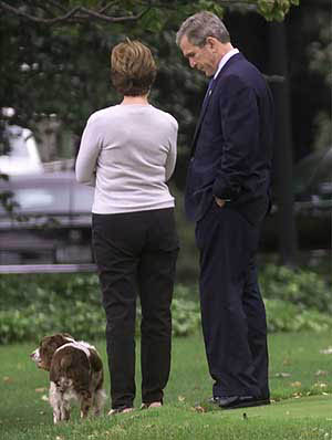 US President George W. Bush talks with his wife Laura on the South Lawn of the White House on wednesday. Bush spoke later in the day at the headquarters of the Central Intelligence Agency in Langley, Virginia. —REUTERS