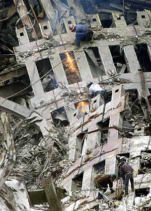 Workers use torches to cut away sections of the destroyed facade of the World Trade Center (WTC) towers in New York on Thursday. It has been more than two weeks since the September 11 attacks on the landmark WTC towers that caused their collapse killing more than 6,000 people. —REUTERS