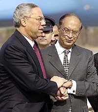 Islamabad is Mr Powell’s first stop on a five-nation trip that includes Afghanistan, India, Nepal and Japan, the venue for an Afghanistan reconstruction conference next week. His aim in India and Pakistan is to build on a relative reduction in tension since President Musharraf, in a speech on Saturday, met more of India’s demands for a crackdown on militant Islamists attacking the Indian forces in disputed Kashmir. “I hope that as a result of my visit we can keep the process moving forward to find a solution to the current crisis,” Mr Powell said. Mr Powell said as a part of the American effort, Washington would press India and Pakistan to lift tit-for-tat diplomatic and travel sanctions they imposed on each other. “Perhaps, we can begin to review and see whether (the sanctions) should still remain in effect... and in due course hopefully there will be military de-escalation as well,” Mr Powell said.