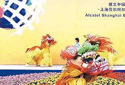 Chinese actors perform a lion dance at a ceremony in Shanghai to mark the launch of Alcatel Shanghai Bell, the first foreign-invested telecom company limited by shares in China. In 2001, the number of China's mobile phone users and fixed phone subscribers accounted for 15 per cent and 17 per cent of the world's total, respectively. China has the most mobile phone users anywhere in the world.