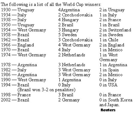 ‘Three Rs’ revive art football Yokohama June 30 Perhaps the most talented offence in years, the trio was too much for everyone at this tournament. The three accounted for 15 of Brazil’s tournament-high 18 goals and some of the World Cup’s most brilliant moments. Against Germany, Rivaldo and Ronaldo teamed up twice to beat the tournament’s best goalkeeper Oliver Kahn, who had allowed only one goal in the six previous matches. In the 67th minute, Rivaldo unleashed a left-footed blast that bounced off Kahn’s chest, and Ronaldo streaked in to tap it home for a 1-0 lead. Twelve minutes later, Kleberson crossed from the right to Rivaldo, and the Barcelona striker let the ball pass, dismantling the defence. It rolled to Ronaldo, who stroked it home from 12 yards out to ice the game. Ronaldo’s eight goals in the tournament gave him the Golden Boot award as highest scorer and were the highest total in a World Cup since 1970, when Brazil won their third World Cup. Rivaldo added five goals, while Ronaldinho had two and an epic game against England that will figure prominently in Brazil’s rich archive of World Cup lore. But it was more than goals, victories and the title. The three Rs revived the “art football” that many Brazilians had defended against critics who called it outdated and inefficient. For Ronaldo, the World Cup was a personal renaissance. When coach Luiz Felipe Scolari named him to the squad in May, many were openly skeptical that the 25-year-old Inter striker could hold up after a two-year absence for knee surgery. Ronaldo worked hard to regain his form, often staying after practice to run laps or work on his finishing. Slowly, his speed and timing came back, and each game was better than the last. “I’ve worked for two and a half years to come back from this injury,” he said. “The goals crowned our effort.” Rivaldo, also recovering from a knee ligament injury when the World Cup began, at last dispelled the notion that he saves his best for his Barcelona club and doesn’t deliver on the national team. Relieved of his playmaking chores and free to create, Rivaldo blossomed. He scored in each of the first five games, including a highlight-reel strike to lead Brazil in a 2-0 win over Belgium. The victory over three-time champions Germany was satisfying, he said, but Brazil had already proved their merit in the World Cup. “It could have been South Korea, Japan, Turkey,” Rivaldo said. “People would respect Brazil’s victory.” Ronaldinho (22) is the firm’s junior partner and its future. A season with Paris Saint-Germain added strength and defence to his wizardly ball-handling skills. His standout play saved Brazil’s qualifying campaign, and the trio was complete. After a slow start at the World Cup, Ronaldinho broke out in a 2-1 quarterfinal win against England. His weaving 40m run set up Rivaldo for the first score, and he added the winner on a pinpoint free kick into the upper corner from 30m out.