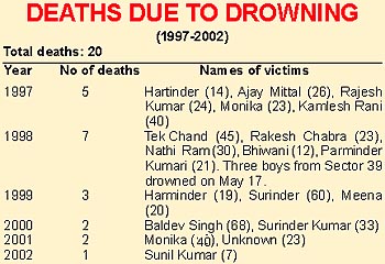 TRIBUNE VIGIL Although deaths due to drowning have occurred at various points all along the lake, the regulator end is much more vulnerable since last year when an uncontrolled flow of water caused a deep scour pit in this area. Experts in the field point out that the pit, about 20 to 30 feet deep, was not filled up and is still harboured by the lake around its regulator end area. Filled up with fine clay, which turns marshy whenever filled with water, the pit becomes all the more dangerous. Unaware of the massive depth of water at the spot, villagers, who visit the lake either to swim or to bathe their cattle, drown in the lake. Further, sources inform that the bed of the lake near the regulator end is very stony. Unlevelled as the bed is, it is quite possible that the swimming children hit the stony bed, sustain injuries and die. Investigations conducted by the Chandigarh Tribune reveal that 22 deaths have occurred due to drowning in the lake over the past five years (1997 to 2002). Most of the cases, however, go unreported. In most of the cases, the bodies have been recovered at a gap of more than a day. The maximum gap ever reported in the recovery of a body was in the case of Surinder Kumar of Dadu Majra who had drowned in the lake on December 1, 2000, and body was recovered on December 7. FIRs registered with the Sector 3 police station, under which the lake area falls, are living records of how people, including children, women and elderly, have often slipped into the lake and drowned. The area of the lake where the start tower for the rowing course and the aligner's platform stand erected is also very unsafe. Although some cases of drowning have occurred under the influence of drugs or poison, most of them have occurred under avoidable circumstances. Talking to Chandigarh Tribune today, Lil Bahadur, father of Sunil Kumar, who died due to drowning yesterday, alleged that there is very poor patrolling of the police in the upstream area. "There should be 24-hour patrolling. My child is dead. May be others are saved," he said. Oblivious of Sunil's death, many young boys from Bapu Dham Colony, Kishangarh and Saketri had gathered at the regulator end this afternoon to swim. Said a 10-year-old Vishwanath from Sector 26, "We come here regularly to beat the heat. We don't know how deep the lake is." Meanwhile, for better patrolling of the lake, the Police Department has decided to provide six cycles to the police personnel deployed at the lake police post. Said a constable on duty, "We have no binoculars to keep a wide watch. If we see a child swimming in a vulnerable area at a far away point there is no way we can reach him. Now that we have cycles, we can hope to function better." Another way to save lives could be erection of boards stating the correct depth of the lake at the most unsafe points. Meanwhile, the Chief Engineer, UT, Mr Puranjit Singh, when contacted, said that there was no structural problem in the lake which could have resulted in deaths due to drowning. He said, "It is very difficult to stop children from entering into the lake and swimming."