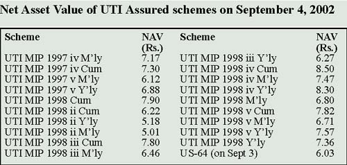 Govt’s package falls short of expectations CHANDIGARH: The Finance Minister, Mr Yashwant Sinha’s decision to bail out the Unit Trust of India (UTI), announced on August 31, has met the investors expectations half way. Though initially it raised hopes among the investors and the capital market, but the final picture that has emerged so far, say market experts and investors, has only provided a short term relief. Later, the Centre’s decision to postpone the disinvestment of HPCL and BPCL has sent a wrong signal to the market, thus affecting the chances of any substantial increase in the Net Asset Value ( NAV), of the UTI schemes, in near future. Package meets expectations half way The investors lament that these decisions would not ensure the expected returns, as promised by the fund managers of government guaranteed scheme. Mr Puran Chand Wadhwa, former DGP Haryana, who had invested huge amount along with his family members, blames the fund managers and inadequate measures taken by the government for the present crisis. He says, “Despite government’s package to the UTI, we would not be able even to get what we had invested years ago. The government has not fixed any responsibility for the financial losses to the investors and the government. Somebody should be punished for playing with our future.” A keen observer of the UTI performance, Mr Wadhwa claims that he had written letters to the PM, Finance Minister and other officials concerned alleging that the UTI had simply turned in to ‘Union of Thugs of India,’ as the investors had completely lost faith in the Centre Government. Still welcoming the government package, he said, “It falls short of our expectations as we would not able even to recover our investments. The next generation should not invest blindly in the government institutions after our bad experience.” Tax incentives Implications for small investors Investors holding more than 5,000 units Mr Dhingra reminds with the current scenario prevailing in the market, the NAV value could not be expected to rise dramatically in the next few months. At the most, the government may provide bonds to the investors with 7-8 per cent rate of interest to keep a section of them with the fund. Warning the investors, he says, “The investors should be sceptical about the future of the fund which is tilted in favour of equity based investment. For regular and secured income, they should look some elsewhere.” However, some other brokers feel that with government’s backing and improvement in the industrial scenario and capital market, some miracle may happen, the best thing is to be on alert, and off-load the units, once NAV crosses Rs 10. They point out with the bifurcation of the UTI, the mutual fund may perform better, like other MFs in the market. MIP investors However, Mr Wadhwa laments that all the MIPs launched during 1997-98 used to provide a secured monthly income, with an assured rate of interest, which declined over the years. He claims, “Since the share of companies, in which UTI had invested blindly fell sharply, their value has come down. Now we would have to learn to live with the uncertainty as the government may not bail out next time.”