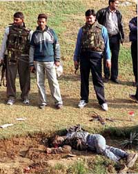 Capital Two AK 47 rifles, six magazines, three hand grenades and 94 rounds of AK 47, kept in a gunny bag, were seized from the car. Special cell sleuths, acting on a tip- off that some terrorists would be entering Delhi to cause explosions at some vital installations in the Capital, saw a Maruti Zen (DL-7C-5921) entering from neighbouring Haryana around 6.00 a.m. When the police party present there signalled the car, carrying three militants, to stop at a checkpost when it entered Delhi, the militants tried to escape. The policemen gave them a chase, resulting in an encounter, close to the offices of the Indian Air Force, the BSF, the ITBP and the CRPF. Joint Commissioner of Police Neeraj Kumar said in the encounter, which lasted about 40 minutes, two militants were killed, while the third, who was driving the car, fled under the cover of darkness. He said a massive hunt had been launched for the militant, suspected to have escaped towards Faridabad. The state police had been alerted. The police also claimed to have recovered a document bearing the name of Tehreek-e-Ghaznavi, a possible cover name of the Lashkar-e-Toiba (LeT), from the vehicle. |