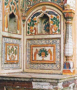 The most striking building is the old haveli, constructed with lakhauri bricks and lime mortar and profusely decorated with wall paintings and floral patterns. The entrance door and the full length of the eastern wall, besides the courtyard walls, bear testimony to the royal taste. The heavy brass-studded and artistically designed front door panels were removed from here a couple of years ago by miscreants. Lala Trilok Das Garg told me that the Raja had engaged Muslim masons and chiteyras for the construction and decoration of the haveli. Even the grandfather of Lala Trilok Das had employed them for construction of their haveli in the main bazaar in the 1920s. The wall paintings depicted the Sikh Gurus, founding fathers of Kalsia state, deities of the Hindu pantheon and auspicious birds like the baaz and mayur. In the absence of proper care, this magnificent old building is falling in ruins. Some of the walls and almost the entire roof of the first floor have collapsed. The haveli is now covered with weeds and rubble. Most of the paintings on its walls have vanished or faded. It can still be resurrected and made to appear as grand as it stood 100 years ago provided the owners are ready to invest sufficiently and convert it either into a local museum-cum-art school of Sikh heritage or at least into a heritage hotel. It is astonishing that the Archaeology Department is unaware of this beautiful heritage building. The Raghunath and Shiva temples built here some 140 years ago by Lala Gopal Sharan Das Mittal are other fine monuments of religious significance in Chhachrauli, which has a population of over 10,000. Within the temple complex, are exquisitely carved wooden projections. Unfortunately, with the migration of the royal family from Chhachrauli, all the buildings in the fort complex have lost their grandeur. Photos by the writer