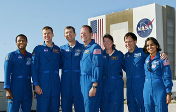 Crew-members of the space shuttle, Columbia, at the Kennedy Space Center in Cape Canaveral, Florida, in this December 20, 2002, file photo. Extreme right is Kalpana Chawla.  — Reuters photo