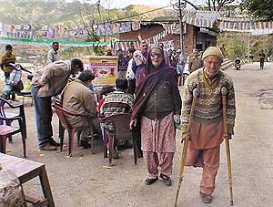 Eighty-year-old Ganga Nisha, who is physically challenged, on his way to cast his vote Eighty-year-old Ganga Nisha, who is physically challenged, on his way to cast his vote at the Kandaghat polling booth in Solan district on Wednesday.
