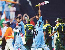 Sheer joy to see the master in full flow Yes, the celebrations are well and truly on and the noise of crackers bursting is absolutely deafening to say the least. And why not, they have just got the better of archrivals Pakistan in a cracking encounter and kept their record intact in the World Cup. I take great pride in calling myself a ‘cricket-purist’ as much as the ‘Indian-ness’ embedded in me. However, having said that it was complete entertainment for 95.3 overs on Saturday. The result did have significance but it was eclipsed by the quality fare put by India and Pakistan together. Before I start lavishing my praises on the important characters of this high profile thriller, it’s pertinent to note that the contrasting brown patch in the middle of the Centurion Park acted as the fulcrum to get the adrenaline pumping for the players as well as the spectators. The wicket was an absolute belter and a first look in the morning gave clear indications of the things to follow. India has always looked upto Sachin Tendulkar to deliver and the master blaster did stand and deliver. Looking Sachin coming out in the middle with a positive frame of mind was heartening, just the tonic Indian fans needed to spring onto their feet and wave the tricolour. The rollicking drives gave India the perfect start they were searching for against a daunting total, made to look more menacing by the bowling attack on the offing but none could stop Tendulkar from going his way-not even a nasty, muscle pull. So the likes of Shoaib and Wasim were quickly taken care off and India breezed past the fifty-mark within a blink of an eye. India seemed to take this match hands down but Waqar led the fight with back-to-back wickets to check the Indian onslaught and the match was still wide open. Sehwag once again wasted a good start while Ganguly did not stay long for people to comment on his style of play. But the good thing was just started to happen. I feel that Kaif’s promotion up the order deserves a pat for the team management. Kaif’s always been like a player, who believes more in milking the bowling with ones and two, getting his eye in before opening out. He is not the Yuvraj type who can start in full gear from the word go and it was encouraging to see Kaif, who has not been in the best of form and under some pressure, come out confidently and hold the fort for India valiantly. His style of play allowed Sachin on the other end to go his way. In my words, Kaif deserves an award in the best supporting role. Sachin Tendulkar’s determination could be seen on his face and its sheer joy to see the master in his full flow. That some one like Wasim watched in awe was testimony to his exhilarating innings. A well-deserved century would have been the icing on the cake but he won’t brood over anything, India has won and that’s important. I must admit that soon after Sachin’s departure, the memories of Chennai Test did come haunting but this time around Yuvraj and Dravid made sure that everything falls into place. Their partnership was important because Pakistan had their tail up after scalping the prize wicket and it needed Dravid’s experience and Yuvraj’s exuberance to set the India ship on shore in style. From Pakistan’s point of view, it’s heart breaking that they have to possibly bow out of this tournament so early on. Anwar’s century, yet another time he came good against India and a total of 272 raised hopes among ardent fans that Pakistan might redo another ‘92 but Sachin had some another plans and by the time Pakistan removed their thorn, the wounds were a bit too deep to heal quickly. The Pakistani bowlers were also guilty of some wayward bowling and inexplicable field setting and soon Pakistan’s body language suggested that they were only delaying the inevitable. Hats off for a true professional approach shown by the Indians and they have now become a source of worry for oppositions. A good sign indeed but’s there’s a lot of distance to be covered yet. But for now, raise a toast for the Indian team. Cheers!