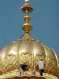 cleaning the golden dome of Akal Takht in Amritsar on Wednesday.