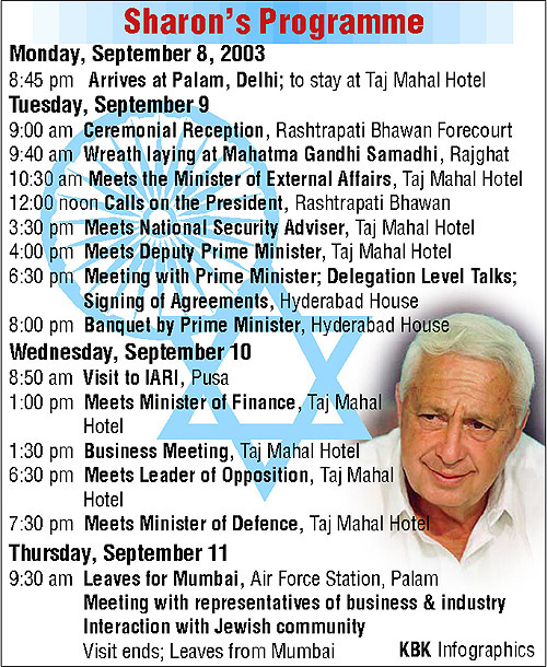 Sharon reaches Delhi, Pak shows concern New Delhi, September 8 Heading a 124-member delegation, including top representatives of Israeli defence industries, Mr Sharon will hold wide-ranging discussions with Prime Minister Atal Bihari Vajpayee tomorrow on a range of bilateral, regional and international issues. The Israeli leader was received at the Delhi airport by Minister of State for Human Resource Development Vallabhbhai Kathiria, Foreign Secretary Kanwal Sibal, India’s Ambassador to Israel R S Jassal, diplomats and senior officials. He will be accorded a ceremonial welcome tomorrow in the forecourt of Rashtrapati Bhavan. A group of Israeli children along with Tel Aviv’s ambassador-designate David Daniel were at the airport to receive Mr Sharon, who posed for photographs. However, he quickly left the airport without having any word with the waiting reporters. ISLAMABAD: Pakistan on Monday expressed “deep concern” over the growing defence co-operation between New Delhi and Tel Aviv and Israeli Prime Minister Ariel Sharon’s first-ever visit to India. —