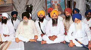 From left: Sant Baba Pritpal Singh, Capt Kanwaljit Singh, Karnail Singh Pir Mohammad, Prem Singh Chandumajra, Kirpal Singh Badungar at an All-India Sikh Students Federation function at Gursagar Gurdwara in Chandigarh on Saturday. — A Tribune photograph