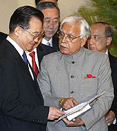 Indian Foreign Minister Natwar Singh (right) chats with Chinese Premier Wen Jiabao before the opening ceremony of the Asia Cooperation Dialogue Foreign Ministers’ Meeting