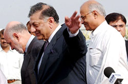 Pakistan Foreign Secretary Riaz Khokhar, flanked by Pakistan High Commissioner Aziz Ahmed Khan (left) and Indian High Commissioner to Pakistan Shivshankar Menon (right), on his arrival in New Delhi on Saturday. — PTI