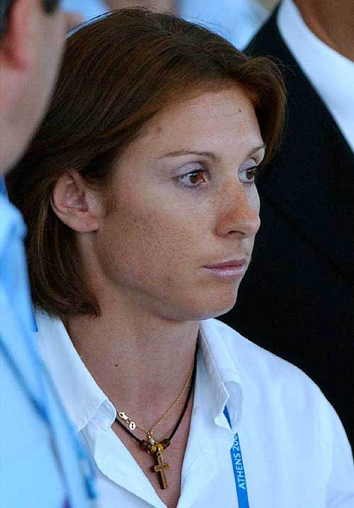 Greek sprinter Katerina Thanou leaves a central Athens hotel after she met the IOC executive board on Wednesday, August 18. Thanou and Kostas Kenteris withdrew from the Athens Olympic Games, nearly a week after they missed a drug test and were later hospitalized following a suspicious motorcycle crash. — AP/PTI photo