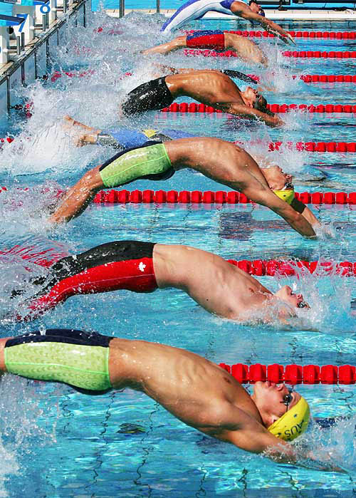 Swimmers in the fourth heat of the men's 200-metre backstroke explode form the start during the Athens 2004 Olympic Games, August 18. From bottom to top are: Australia's Patrick Murphy, Canada's Nathaniel O'Brien, Australia's Matt Welsh, Croatia's Gordan Kozulj, Russia's Arkady Vyatchn, Japan's Tomomi Morita and Spain's Aschwin Wildeboer. — Reuters photo