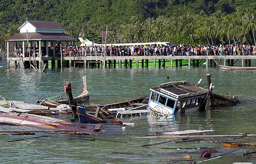 Thai and foreign tourists flock a pier on December 27 as they wait to be evacuated from the famous resort island of Phi Phi in Krabi province, southern Thailand. — AP/PTI