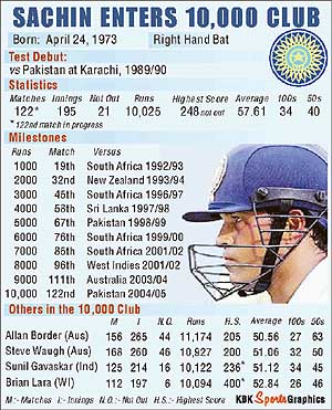 Kolkata, March 16 "I am very happy to join the four great players in the 10,000 club. Its nice to join the elite league," said the master blaster, who became the second Indian after Sunil Gavaskar to reach the milestone. Relaxed and composed, as he always was, the batting ace said he definitely was a happy man to reach the mark, but had "no special feeling" while achieving the feat at the Eden Gardens. "I did not have anything in my mind. All of a sudden, the crowd reaction was different. I was pretty much relaxed. There was no special feeling as such," Tendulkar said at the post-match press conference. If that was just satisfying, the missing of the record-making 35th century was "not at all" disappointing. "I am not at all disappointed. There is more to cricket, more to life. If I keep thinking about it, I can't play. When its to happen, it will happen," was the philosophic response from the Mumbai batsman, who would turn 32 next month. However, the little master gave a warning to the bowlers all around the world, saying "I hope that I don't stop here. I have plenty of cricket left in me and want to go on scoring runs." Asked about a possible time frame for scoring the eagerly awaited 35th Test ton, Tendulkar said "I go for scoring hundred in each and every innings...hope I get it soon". Looking sympathetic to his numerous fans as also the scribes present, a smiling Tendulkar said "it seems you are pretty much disappointed (at my missing the hundred)." Recalling his dismissal on 94 in the first Test at Mohali, he said "when I went to bat, nobody talked about it (35th hundred). But when I got out, everybody was saying you just missed it". Coming back to the 10,000-mark, Tendulkar said he felt good to touch the landmark and wanted to thank all those who contributed to his 15-year-long cricketing career. "Feeling achcha hain. 10,000 in Tests banana aasan nahi hain. kafi sacrifice karna parta hain. (the feeling is good. Its not easy to score 10,000 runs in Tests. You need to sacrifice a lot). "Its basically a team work. My father, two brothers, wife, coach, teammates and the crowd - without their support, it was not possible. I thank them all." He felt elated to join the four great batsmen of world cricket - Allan Border, Steve Waugh, Gavaskar and Brian Lara - in the 10,000 club. "When you join the elite club, you seat on a different league altogether," he said. However, Tendulkar, who also has the distinction of scoring over 10,000 runs in one day internationals, rated his achievements in the shorter version of the game at par with the achievement in Test cricket. "Scoring runs have never been easy in both versions of the game. I value my 10,000 runs in ODIs as well,'' Tendulkar, who has scored 13,497 runs and 37 centuries in one dayers, said. The master batsman was also happy to achieve the feat at Eden Gardens, which was "a special ground" and had a different type of response from the crowd. Tendulkar, who was dismissed on 52 today, said he did not try to play differently in this innings. Asked which among the first and the 10,000th run in Test cricket would be more memorable to him, he said "both are important. That (the first run) started my career. Here I am in my prime time. I feel both are equally important."