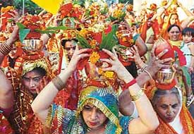 Devotees take part in a ‘kalash yatra’ at Pracheen Sri Hanuman Mandir, Sector 32,