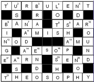 Across 6. King Harsha’s court poet 8. Russian ruler of the past 11. A reclusive Christian group in Pennsylvania 12. Shake head in agreement 13. Sir Syed’s university (inits.) 14. Great teller of fables 17. To gain as due return 19. Despatch 21. Spiritual movement to which Annie Besant belonged Down 2. The only superpower now left (inits.) 3. Stoker, creator of Dracula 4. A great many; great deal 5. Training ground for Indian soldiers (inits.) 6. Bout of excessive indulgence 7. Kamaraj____. Tamil leader 9. Form; appearance 10. Circular or spherical in shape 15. Combining form, meaning ‘within’ 16. How Rajneesh is referred to 18. What fire often leaves behind 20. Classic drama of Japan Solved