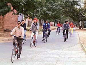 trees.... Chandigarh has a large number of them, and we are trying to discover and take care of them," said the organiser. Then the rally reached Open Hand monument, making its way through Kansal and Naya Gaon. Here the young cyclists had a thrilling time as they let their bikes down, down and down, and huffed and puffed as they pedalled their way up again, before leaving for the Lake Cafeteria. Over a cup of tea, environmental issues were discussed informally. But, yeh dil mange more. Can't we have such rallies more often: Every week, once a fortnight, at least once a month? Why ever not? It is good for the city's environment and everyone's health. But Yuvasatta's own New Year wish is that more and more people begin to use bicycles and the cycle tracks as Chandigarh is one city almost tailor-made for bicycles. — Photos & Text: Pramod Pushkarna
