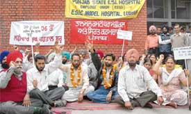 Staff members of the ESI Model Hospital sit on a chain fast in Ludhiana on Monday. Mr Darshan Singh Bhatti and Mr Rajesh Mishra began the chain fast after a gate rally. The employees were demanding implementation of Punjab government service rules, OPD facility for the hospital staff and a bilateral settlement of pending issues.