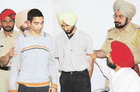Two accused in the Ramandeep murder case being presented before mediapersons in Ludhiana on Saturday.
