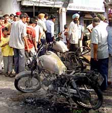 A new Hero Honda parked outside a motor cycle agency and two other motor cycles were also destroyed in the fire. Fire Brigade personnel had a tough time in putting out the fire. The cause of the fire could not been ascertained immediately. |