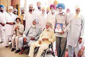 Mr Kirpal Singh, secretary, Punjab Freedom Fighters Association, and an INA veteran, along with villagers of Bhaini Rora express their anger over denial of pension to Sarjit Kaur, INA veteran's widow, at her bhog ceremony on Wednesday. — A Tribune photograph