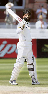 Pakistan’s Mohammad Yousuf raises his bat after completing a double century on the fourth day of the first Test against England at Lord’s on Sunday. — Reuters