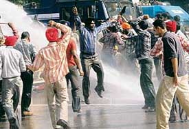 The protesting Punjab Armed Police personnel, who have been selected in 1993 and, since then, not given belt numbers faced water cannons during a rally at Matka Chowk, here today.