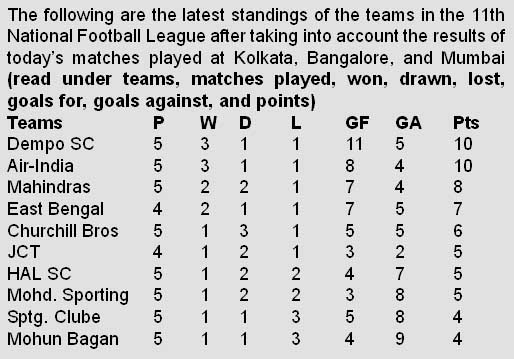 Bangalore: Local giants Hindustan Aeronautics Limited Sports Club defeated Sporting Clube de Goa 2-1 to garner full points from their fifth round National Football League match here today. Xavier Vijayakumar scored in the 44th minute and Satish Kumar (82nd minute) for the HAL while the Goan club reduced the margin in the 70th minute through a penalty kick, converted by Nigerian Macpherlin Dudu at the Bangalore Football Stadium. This win put HAL ahead of Mohun Bagan and Sporting Clube de Goa, who both have four points from five matches in the league table. Dempo down Bagan 2-1