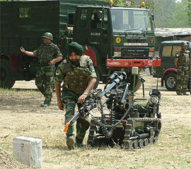 Various steps involved in the use of the latest technology for disposal of bombs were on display. The first step involved the arrival of the squad with one jammer vehicle. The jammer vehicle, which is meant to bar all signals and use of remote control systems to activate unexploded bombs, was stationed at short and safe distance from the site.